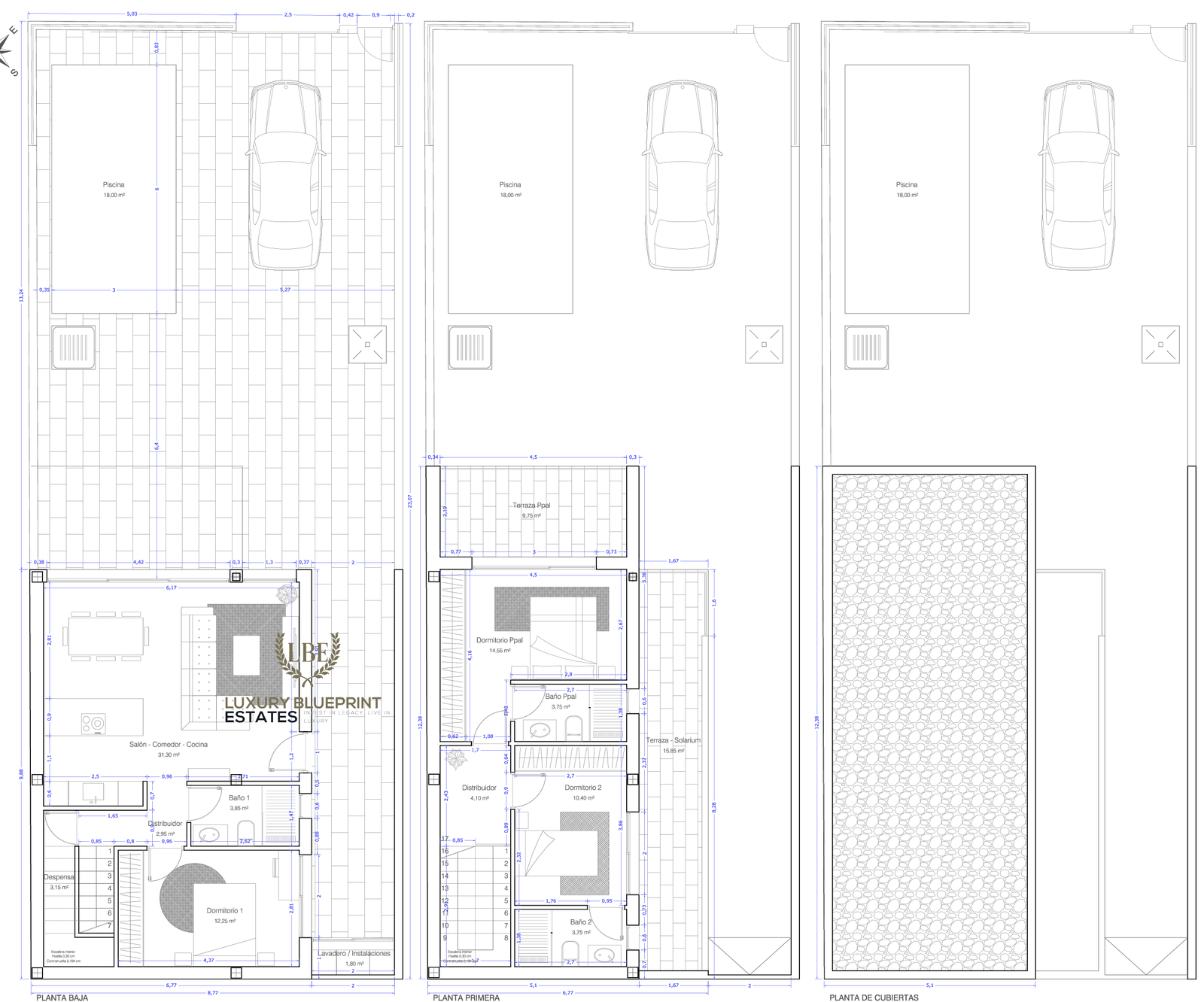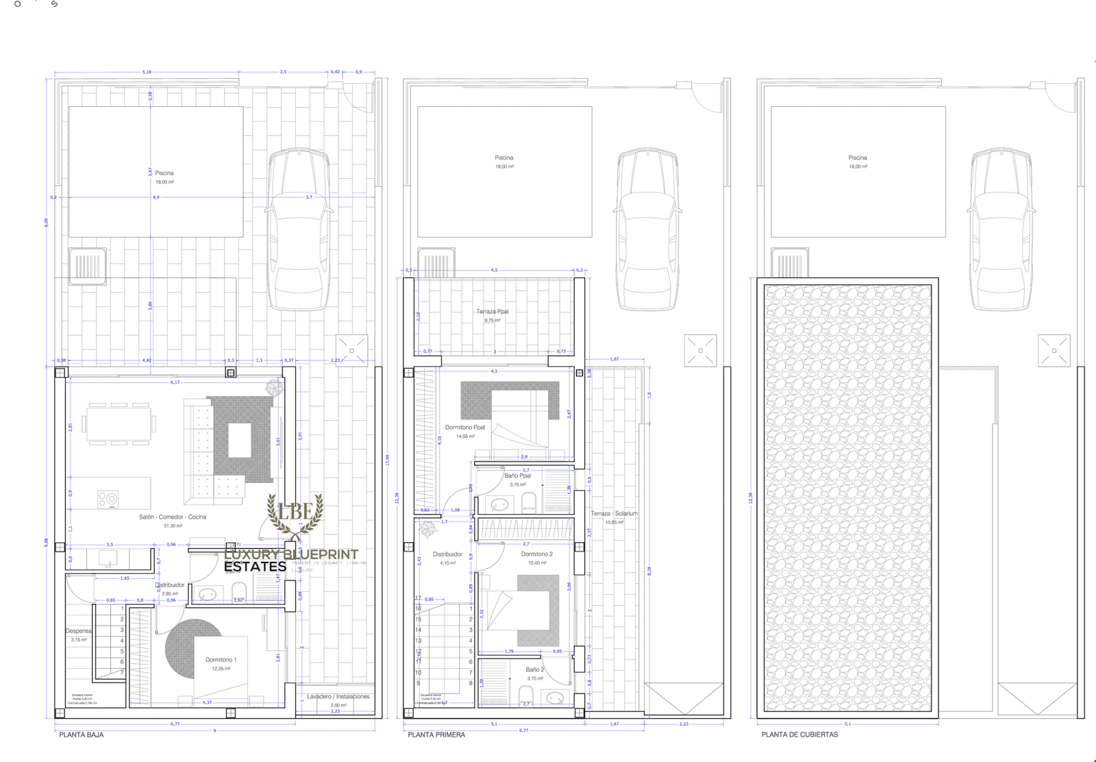Cada villa cuenta con 112 metros cuadrados de espacio habitable cuidadosamente diseñado, distribuidos en dos plantas. La planta baja te recibe con una sala de estar luminosa y aireada que se integra a la perfección con una cocina de planta abierta, creando un ambiente moderno y funcional. En este nivel también encontrarás un dormitorio con armario empotrado, un baño completo y un práctico trastero.