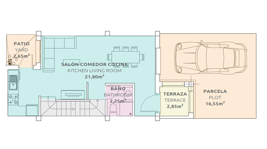 Planta Baja: Un espacioso salón-comedor, un baño y una cocina semi-independiente, pensados para la vida social y familiar.