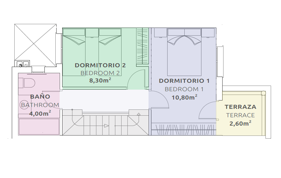 Primera Planta: Dos dormitorios luminosos, un baño, y la joya de la corona: el acceso a su terraza solárium privada, su rincón personal para tomar el sol, cenar al aire libre o, simplemente, disfrutar de las estrellas con su grifo exterior listo para refrescar.