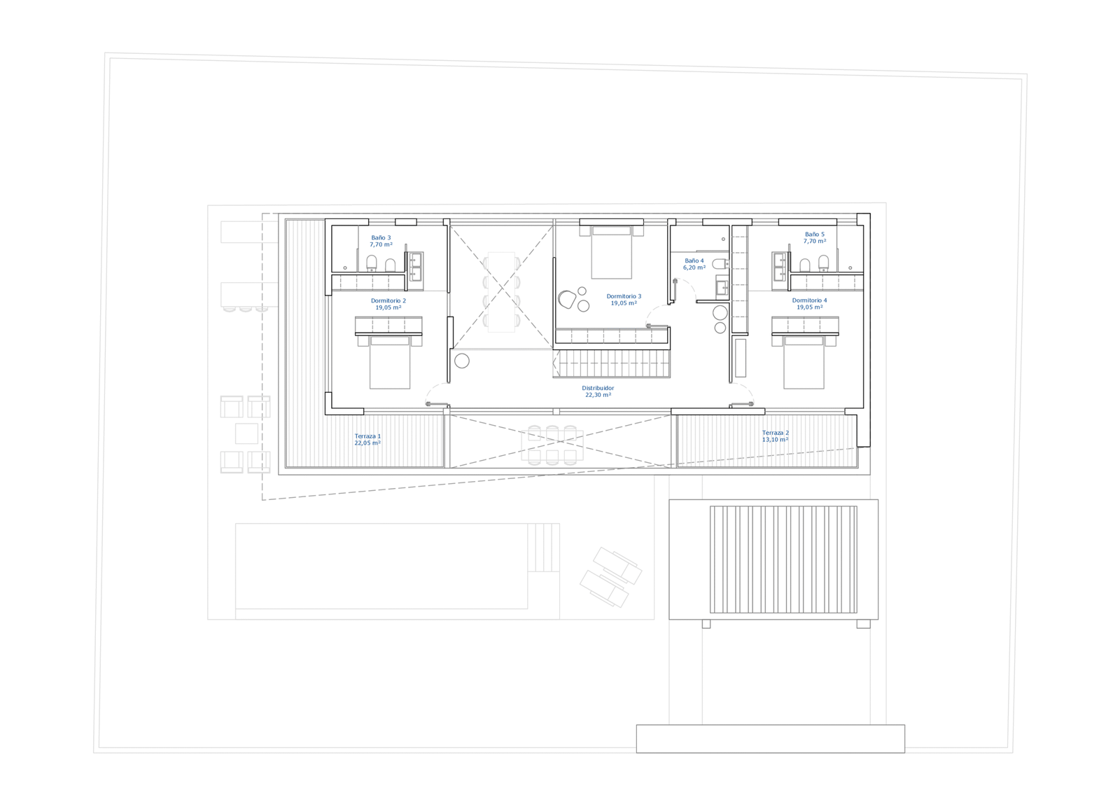 Una piscina de 27 metros cuadrados adorna la zona exterior, sirviendo como punto central para el ocio y el entretenimiento. Alrededor de la piscina, un oasis meticulosamente diseñado crea un ambiente sereno, con una enorme zona de barbacoa y elegantes zonas de estar para reuniones y momentos de relax. El uso de materiales de primera calidad garantiza la durabilidad y un atractivo estético que se integra a la perfección con el diseño general.