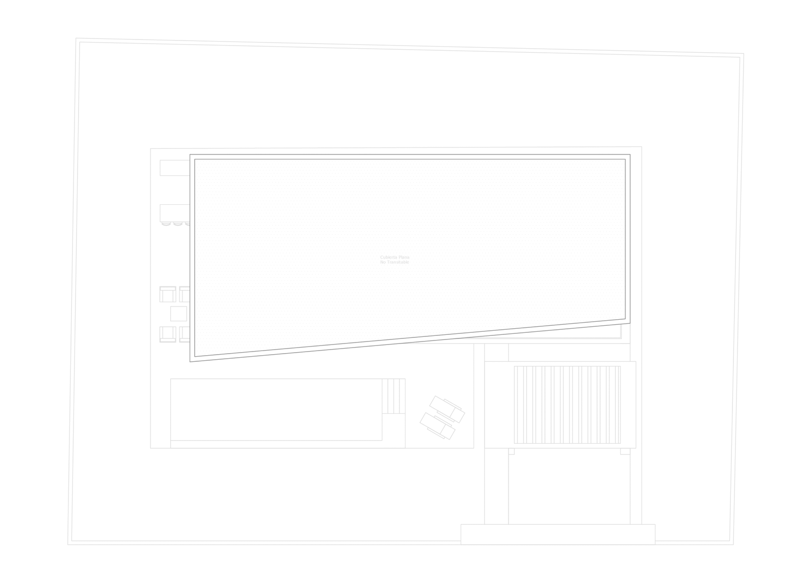 Tejado plano no transitable, acabado con aislamiento térmico de poliestireno extruido. La impermeabilización se realiza con tela asfáltica, terminada con una capa protectora de grava, de acuerdo con el CTE.