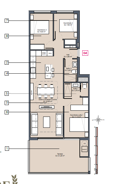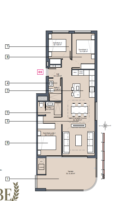 Los apartamentos cuentan con 3 amplios dormitorios y 2 elegantes baños, todos acabados con materiales de primera calidad que aportan un toque de distinción.