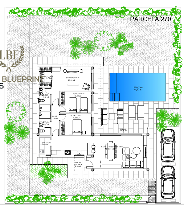 Todas las viviendas incluyen piscina privada rectangular con iluminación nocturna,