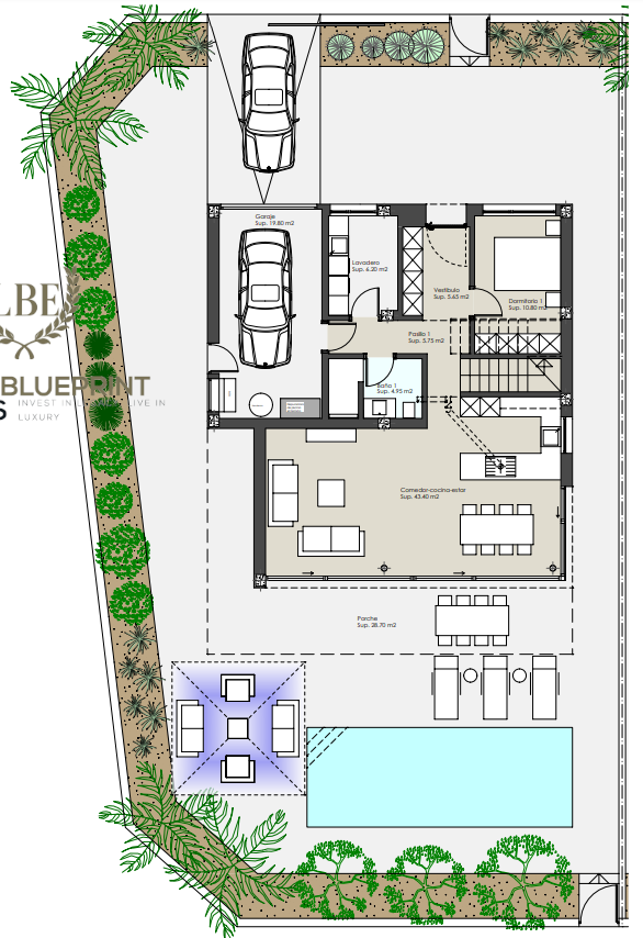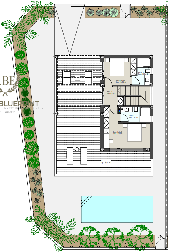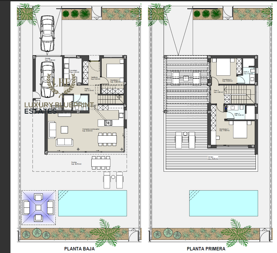 Los espacios exteriores destacan por sus amplios jardines privados, piscinas individuales y terrazas espaciosas que invitan al descanso y al entretenimiento.