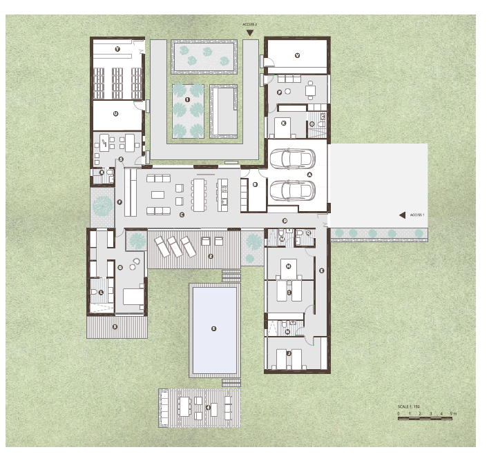 esta residencia de una sola planta destaca por su distribución abierta que integra cocina, comedor